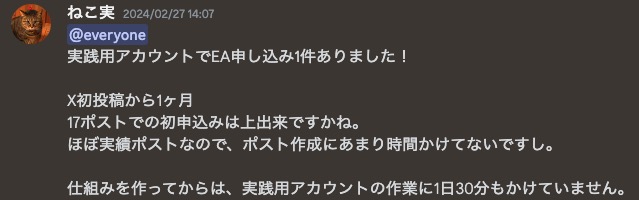 ねこ実さんのノウハウは、そのノウハウ自体もかなり魅力的ではありますが、なんといってもねこ実さんのお人柄は本当に丁寧で、半年以上一緒にオープンチャットやDMのやりとりもさせて頂いておりますが、本当にいつも安心してお話できます。